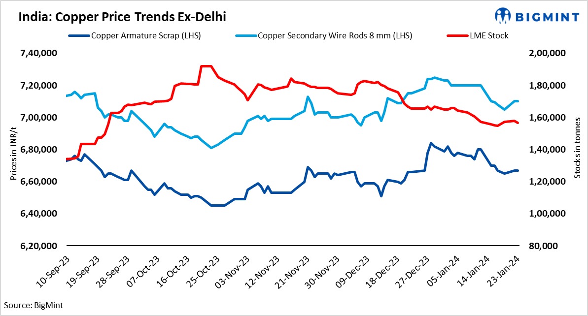 India’s domestic copper market prices remained firm d-o-d. Armature scrap prices stood at INR 667,000/t and secondary rods prices were at INR 710,000/t, both ex-Delhi. Copper prices on MCX were at INR 716,000/t, range-bound d-o-d. However, South America-origin 40 t aluminum talk was heard traded at 52.2% of LME price CFR West coast India.