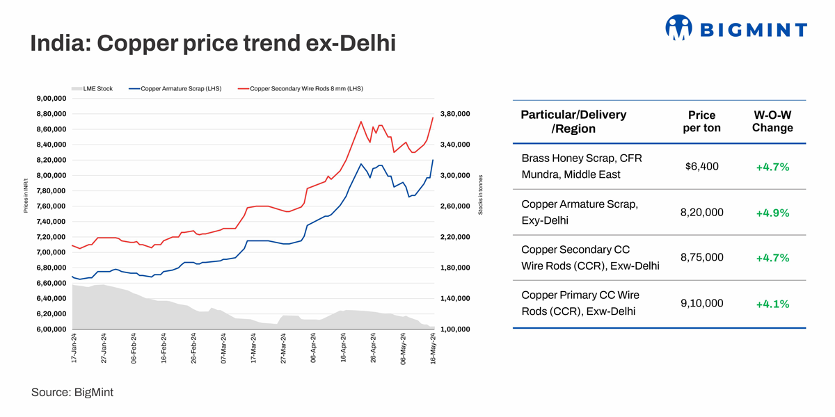 BigMint’s assessment of domestic copper armature prices have been reported at INR 820,000/t, exy-Delhi, rising w-o-w, reflecting an increase of 1.2%. Notably copper prices in the futures market of London Metal Exchange (LME) have hit 2-year high levels i.e. up over $10,300/t levels recently.