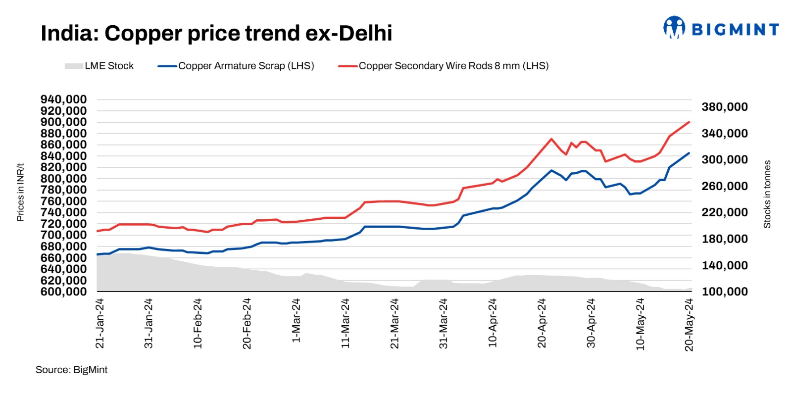 BigMint’s assessment of domestic copper armature prices have been reported at INR 845,000/t, exy-Delhi, rising w-o-w, reflecting an increase of 3%. Notably copper prices in the futures market of London Metal Exchange (LME) have hit over 2-year high levels i.e. up over $11,000/t levels recently making local prices surge with imported offers of copper small motors from EU/USA heard at $1,400-1,450/t to Mundra.