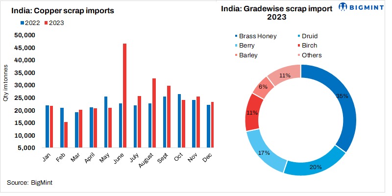 - In December 2023, India’s copper scrap imports declined by 9% m-o-m to 23,260 t from November’s 25,552 t. However, there was a 4.9% rise y-o-y.
