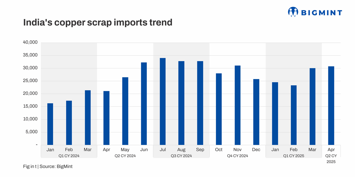 India imported around 78,000 t of copper scrap in Q1 2025 – up as against 55,055 t during the same period in 2024. The uptrend signals improving demand from secondary manufacturers despite seasonal dips in domestic scrap collection post-festive season.