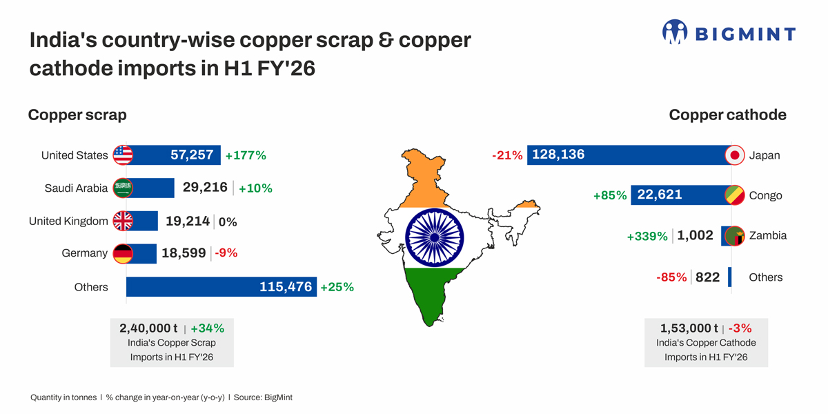 India’s country-wise copper scrap copper cathode imports in H1 FY’26