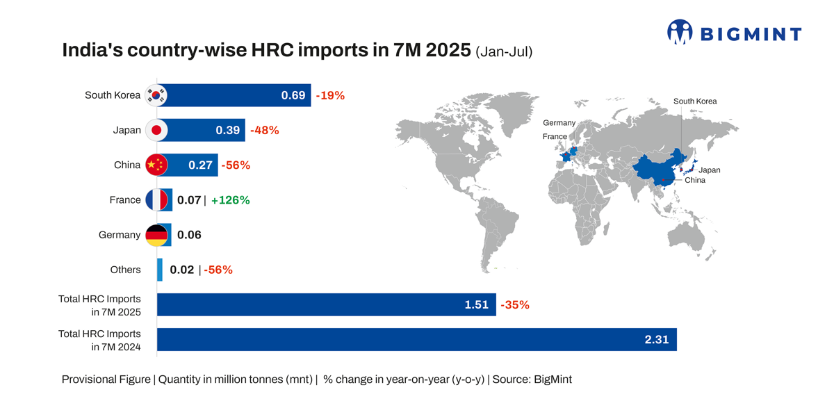 India imported approximately 593,288 t of finished flat steel from Vietnam in CY’24, down by 40% from 988,797 t in CY’23. Moreover, India imported approximately 467,032 t of HRC from Vietnam in CY’24. However, no HRC imports from were recorded for H1CY’25.