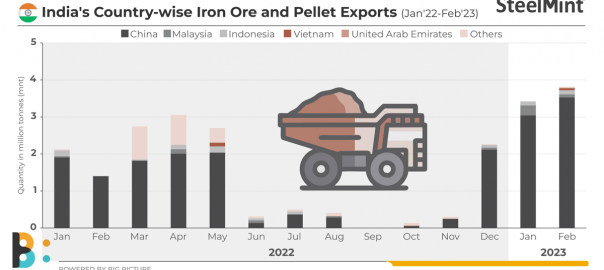 Exports of iron ore and pellets from India climbed to a 20-month high of over 3.8 million tonnes (mnt) in February 2023, as per SteelMint data. China remained the leading importer of Indian iron ore and pellets in February at over 3.5 mnt, or roughly 92% of total exports by India. At over 12 mnt, China’s share in India’s iron ore and pellet exports in 2022 stood at 77%. Malaysia, Indonesia, Vietnam, Germany and the UAE were among the other importers.