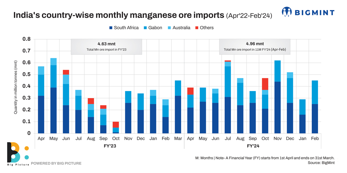Exports of manganese ore by South Africa to India, which comprised a leading share in the total volumes, increased by 56% in February 2024 to 0.25 mnt as against 0.16 mnt in January. Imports from Gabon surged 54% m-o-m to 0.20 mnt in February compared to 0.13 mnt in January.