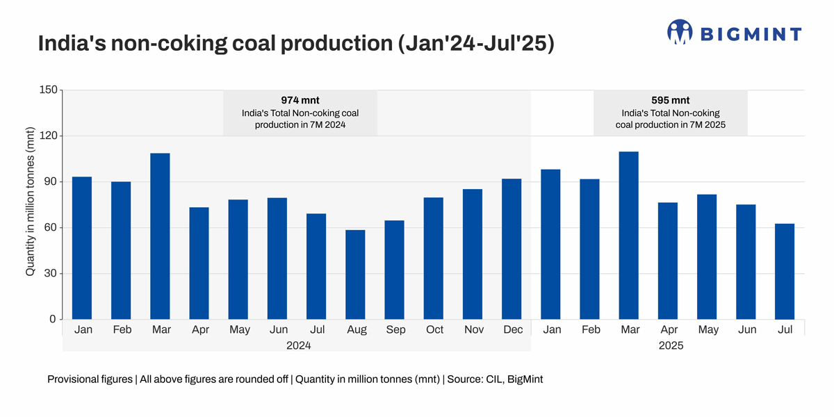 India’s imports of non-coking coal, used for thermal power generation and in the industrial sector, declined to a 2-year low of 11.76 million tonnes (mnt) in July 2025, a drop of over 22% m-o-m and 21% y-o-y, as per latest data available with BigMint.