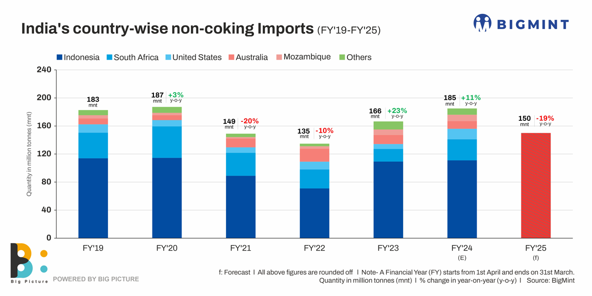 In FY’24, 60% of India’s non-coking coal imports are expected from Indonesia, while shipments from South Africa, at around 30 mnt, are likely to make up for 16% of total imports. Shipments from Australia, at 15 mnt, are likely to constitute 8% of total non-coking coal imports.