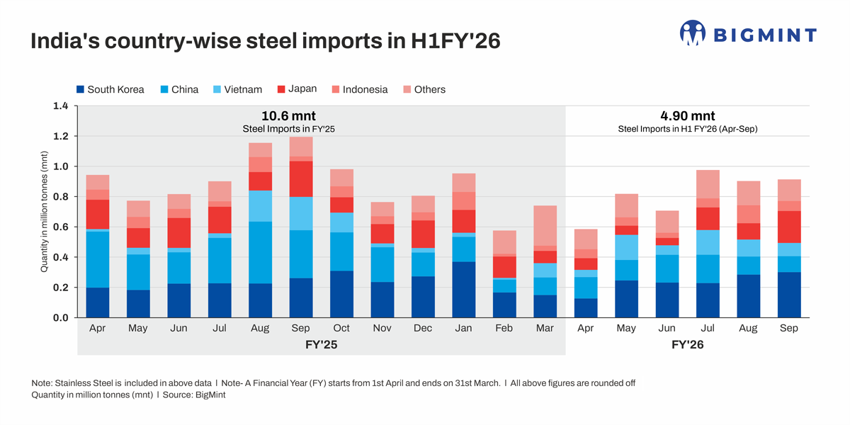 South Korea, with which India has a free-trade agreement (FTA), was the top steel exporter to India during H1FY’26. Volumes grew 7% y-o-y to 1.42 mnt. Next was China, with 0.87 mnt, reflecting a steep 53% drop y-o-y. Japan, another FTA partner, shipped 0.66 mnt, down 38% y-o-y. The implementation of the safeguard duty has helped India reduce inflows from China and Japan.