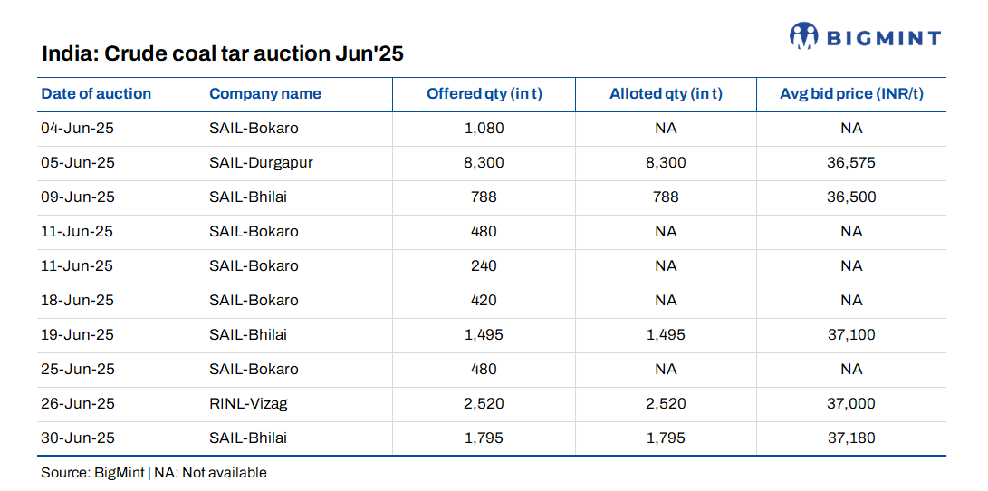 India’s crude coal tar (CCT) market witnessed a significant contraction in supply during June 2025, even as auction prices reflected mixed trends across different producers.