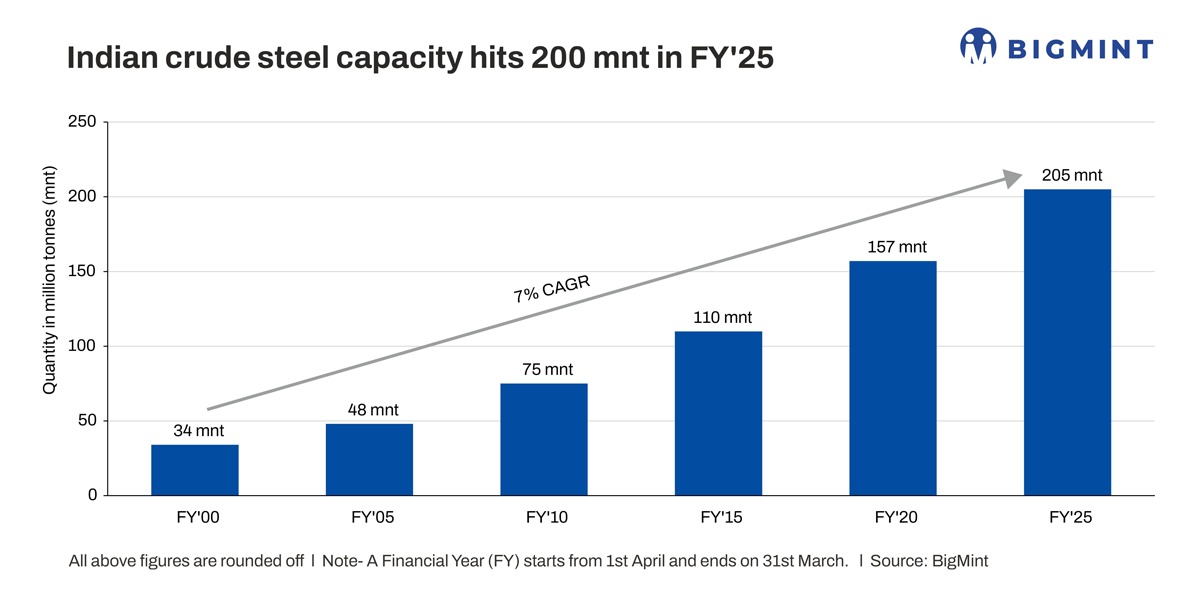 Morning Brief: India’s crude steel production capacity increased by over 10% y-o-y in FY’25 to reach 205 million tonnes (mnt) as against 186 mnt in FY’24, according to provisional data maintained with BigMint. Capacity has almost doubled in the last 10 years from 109 mnt in FY’15.