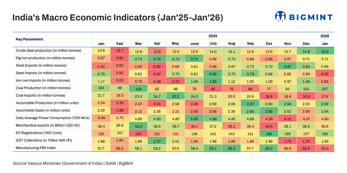 Morning Brief: India’s crude steel production hit a record 15.15 million tonnes (mnt) in January 2026, the highest monthly volume ever recorded. Expectations of 8-10% steel demand growth in FY’26 have kept the Indian steel industry’s prospects bright and pushed steelmakers to steadily ramp up output.