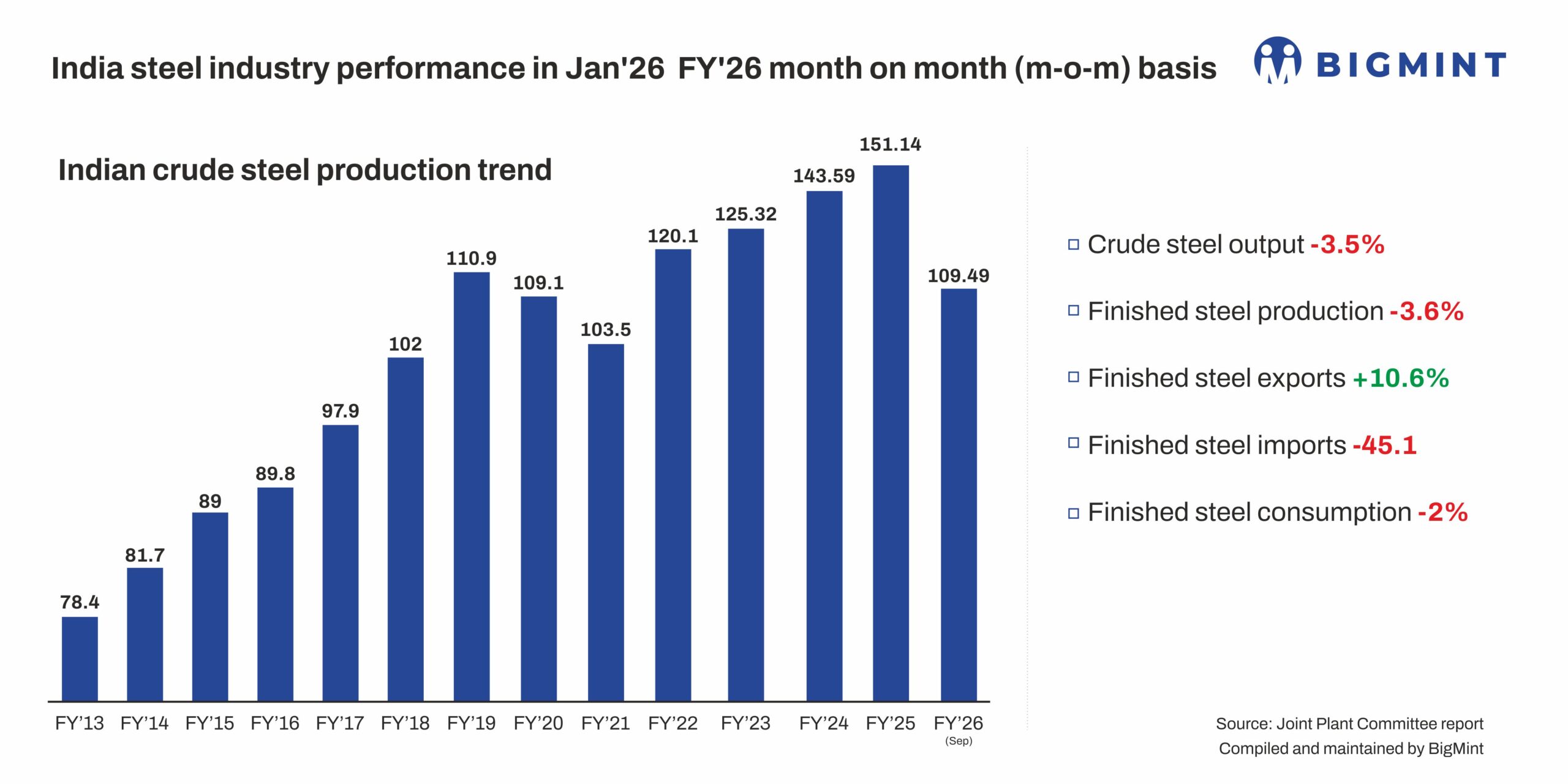 Finished steel imports fell steeply on m-o-m and y-o-y bases in January 2026. Similarly, there was a sharp contraction y-o-y during 10MFY’26.