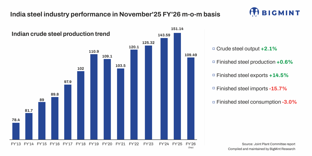 India’s crude steel production posted steady growth in November 2025 supporting a firm rise in finished steel exports, while import volumes saw a sharp decline on both m-o-m and y-o-y basis, according to provisional data from the Joint Plant Committee (JPC) under the Ministry of Steel. Overall steel output remained strong on monthly and yearly comparisons, and although finished steel consumption dipped m-o-m, it continued to register healthy y-o-y growth.