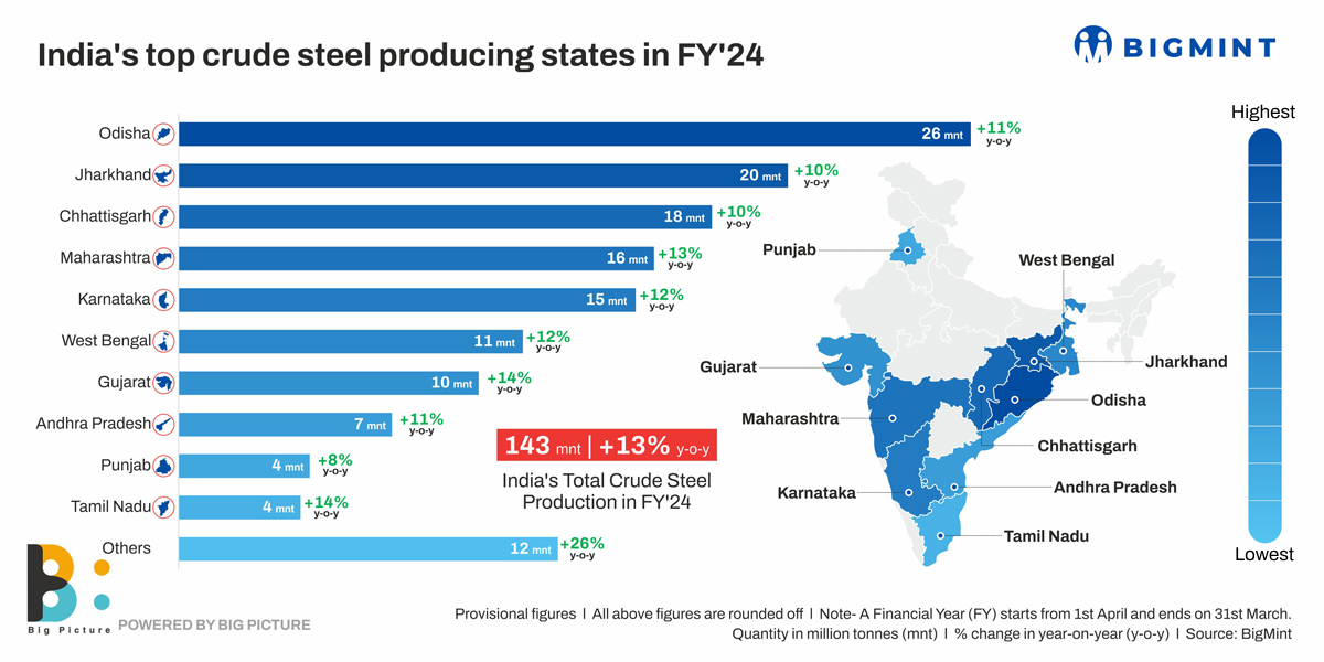 India’s crude steel production up 13% in FY’24. Which were top producing states?