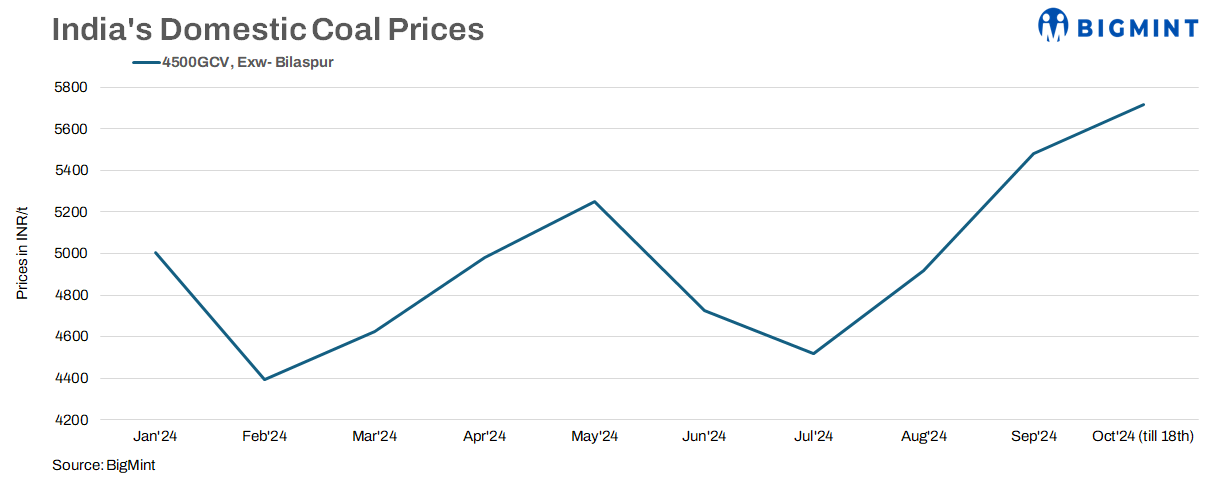 India’s domestic coal prices saw a modest increase this week following a hike in bids at SECL’s auction held yesterday. BigMint’s assessment showed that 4500 GCV coal rose to INR 5,800/t exw-Bilaspur from INR 5,700/t w-o-w. Meanwhile, 5000 GCV coal increased to INR 6,900/t from INR 6,750/t.