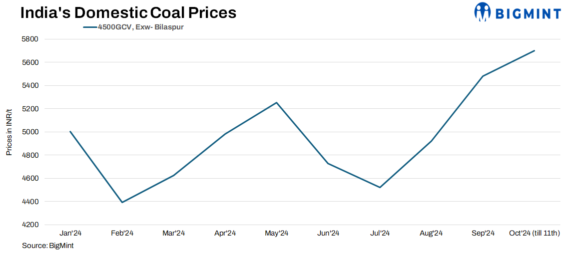 India’s domestic coal prices remained stable this week. Demand remained stable. BigMint’s assessment showed that 4500 GCV coal stood at INR 5,700/t exw-Bilaspur, unchanged w-o-w. Meanwhile, 5000 GCV coal was at INR 6750/t, also stable w-o-w. Usual demand continued, with upcoming e-auctions scheduled, potentially influencing future prices.