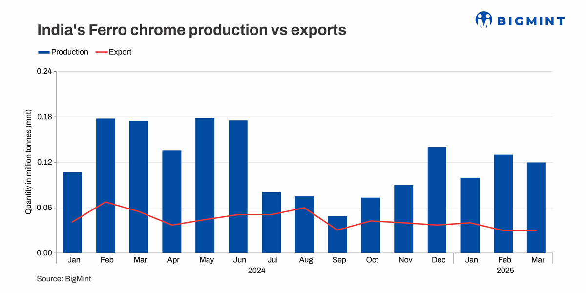 Morning Brief: India’s production of ferro chrome witnessed a decline of 6% to 650,000 tonnes (t)-0.65 million tonnes (mnt)-in October-March (H2) of financial year 2024-2025 (FY’25) compared with 0.69 mnt in H1FY’25, as per provisional data with BigMint.
