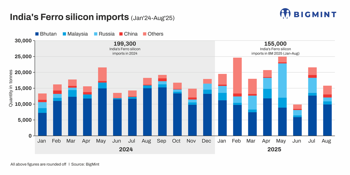Bhutan’s current monthly capacity production capacity of ferro silicon is around 15,000-16,000 t. Three new are expected to start production in the next quarter: ACE Himalayan Ferro Alloys (around 2,200 t monthly production), Samtse Ferro Alloys (2,400 t monthly) and BMML Ferro Alloys (around 2,400 t monthly). This will see total capacity addition of around 7,000 t per month.