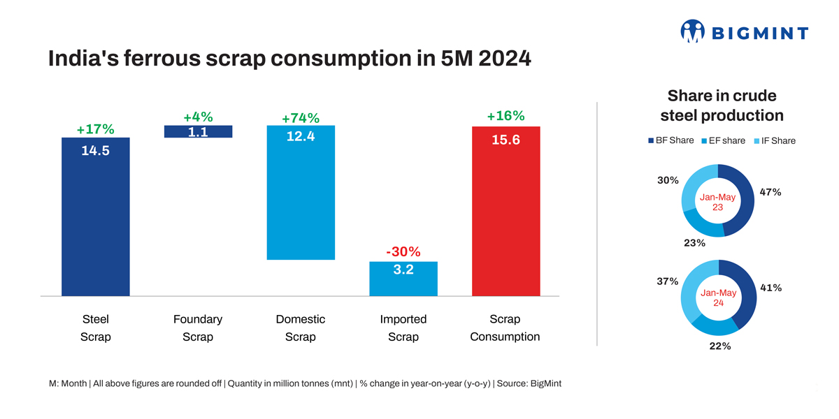 India’s ferrous scrap consumption, both for steelmaking and in the foundry industry, stood at around 16 million tonnes (mnt) in January-May 2024 (5MCY’24), an increase of 16% as against 13.43 mnt in the same period of last year. Scrap consumption in steelmaking rose by 17% y-o-y during January-May to 14.51 mnt compared with 12.39 mnt in the year-ago period, as per the latest BigMint data. Domestic consumption climbed to 78% of total steel scrap consumption, amounting to 11.27 mnt in 5MCY’24 compared to 57% (7.10 mnt) in the year-ago period. Therefore, the share of imported scrap dropped to 22% (3.24 mnt) in 5MCY’24, down from 38% (4.66 mnt) in the corresponding period of last year. Total scrap consumption in 2023 stood at over 31 mnt,as per data.