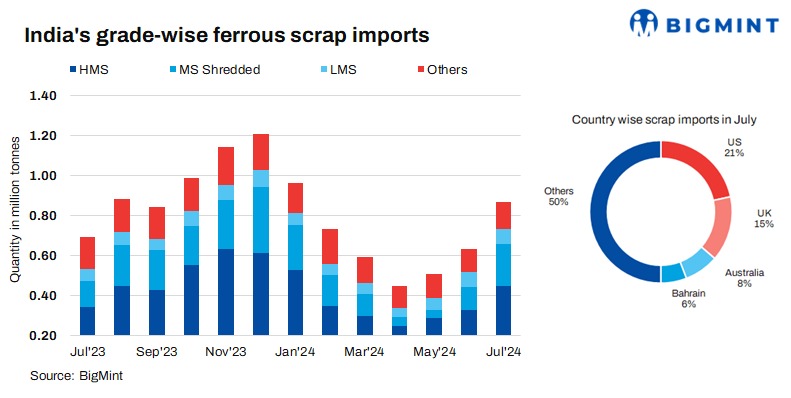 Light Melting Scrap (LMS): In July 2024, imports of LMS scrap showed a steady rise, climbing 6% m-o-m to 76,960 t from 72,553 t in June. This increase also marked a 27% y-o-y growth compared to 60,799 t imported in July 2023.