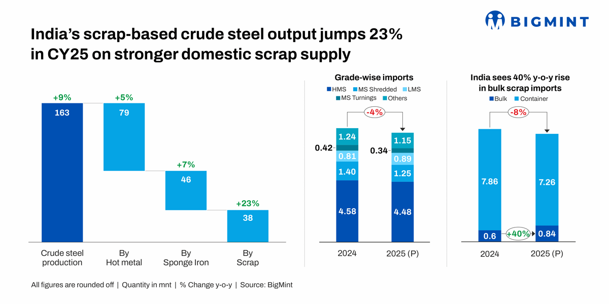 BigMint expects India’s ferrous scrap demand to remain structurally firm into CY’26, supported by steady steel production and rising recycling intensity. We see scrap consumption increasing toward 45-46 mnt, while domestic scrap generation is likely to improve to around 35 mnt, keeping imports close to 9 mnt.