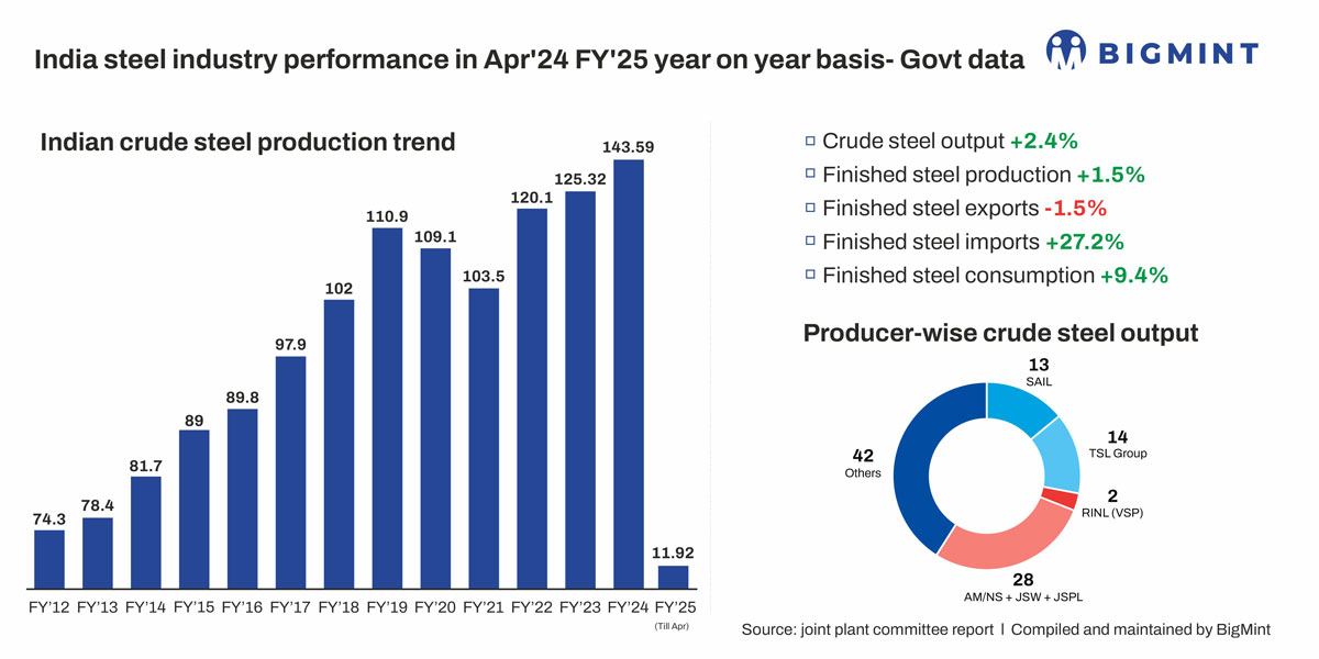 Finished steel imports into India experienced an increase of 2.5% m-o-m to 0.585 mnt in April 2024 as compared to 0.571 mnt in March 2024. However, imports rose by 27.2% y-o-y from 0.460 mnt in April 2023.
