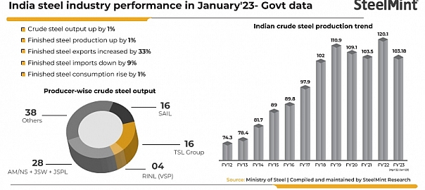 Crude steel production by Indian mills stood at 10.68 mnt in January 2023, up 1% from 10.57 mnt in December 2022. However, output fell y-o-y compared to 10.96 mnt a year ago.