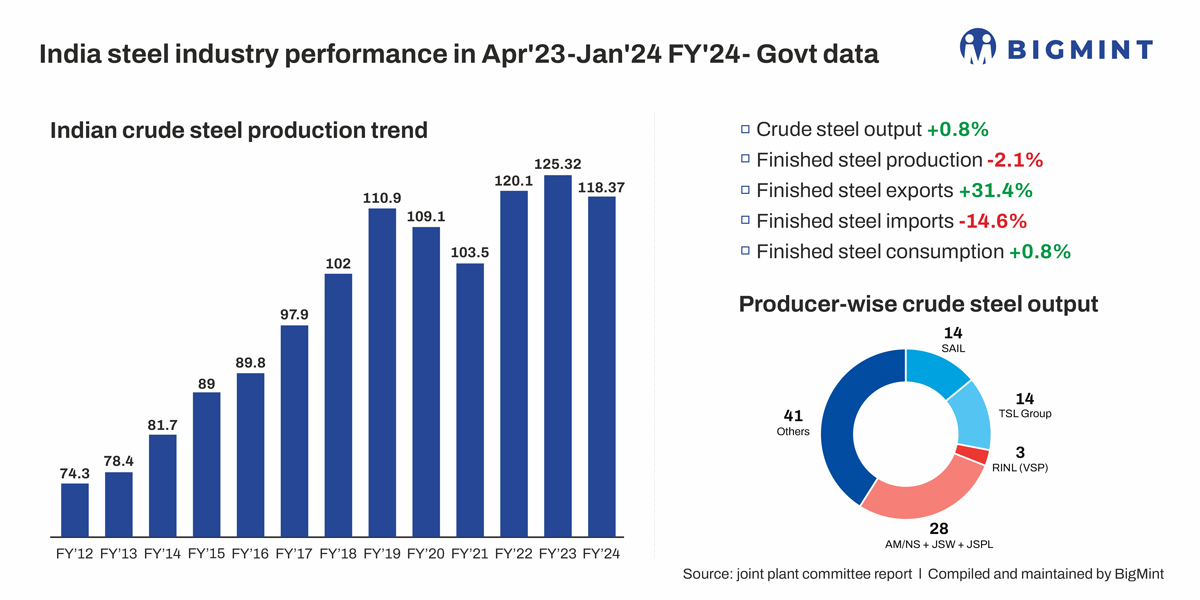 Crude steel production inched up by 0.8% m-o-m from 12.239 mnt in January 2024 to 12.141 mnt in December 2023. Moreover, production displayed a healthy y-o-y growth of 5%, surpassing 11.658 mnt produced in January 2023.