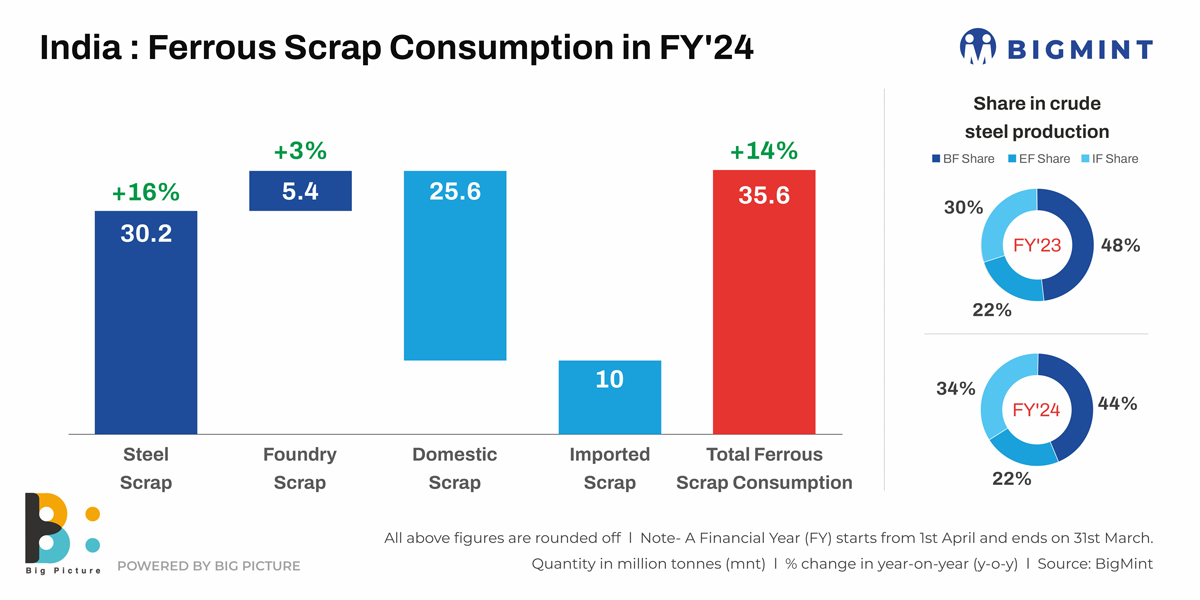 Morning Brief: India’s total domestic ferrous scrap consumption (including steel and foundry) is slated to rise a moderate 14% to around 36 million tonnes (mnt) in financial year 2023-24 (FY’24), as per BigMint’s estimates. Consumption volumes in FY’23 were at 31 mnt.