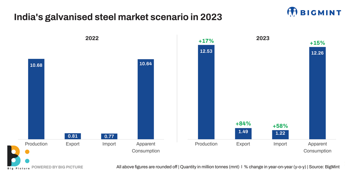 India’s galvanized steel exports rose more than 80% to nearly 1.50 million tonnes (mnt) in calendar 2023 (CY’23) compared to a much lower 0.81 mnt in CY’22. Data tracked till the last six years shows that CY’23 registered the highest exports of this material in this period, the second-highest being 1.39 mnt in 2018. Last year, galvanized exports’ share doubled to 22% share (1.50 mnt) in the entire flat steel exports basket of 6.71 mnt against 11% in CY’22.