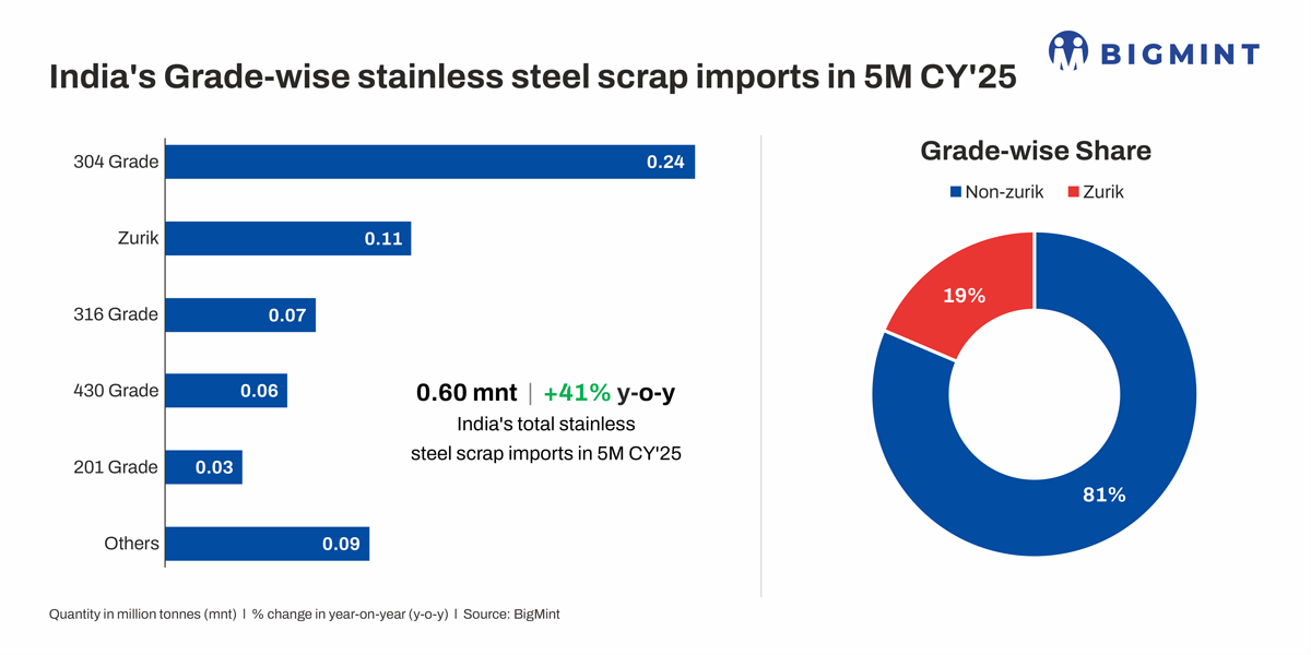 Data shows that 300-series scrap dominated the market, accounting for 0.431 mnt of total imports in 5MCY’25, a substantial 56% increase from the previous year. Imports of 200-series scrap increased by 8% to 47,000 t, as per data, while 400 series saw a 6% rise in imports to reach 79,000 t. Grade-wise, imports of 304 grade scrap surged 72% to 0.239 mnt, while zurik rose by 24% to 0.111 mnt. Imports of 316 grade increased sharply by 75% to 68,000 t. Imports of 430 and 201 grades edged up by 4.4% and 10%, respectively, while other grades increased by 26%, reflecting broad-based demand across grades.