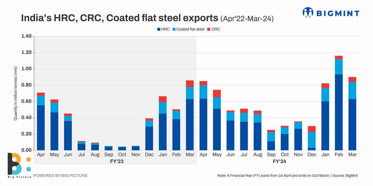 HRC production increased 6% to 14 million tonnes (mnt) in Q1 (January-March, 2024) against 13 mnt in Q4CY’23 (October-December) and 13% from 12.55 mnt in Q1CY’23. This was mainly on account of increased supplies in the market. NMDC’s Nagarnar Steel Plant starting commercial production from late last year while JSPL commissioned its 5.5 mntpa hot strip mill at Angul. But demand lagged behind supply which pressured down prices. Tier-1 mills, challenged by the triple whammy of low domestic and overseas demand and excess supply, eventually resorted to maintenance shutdowns. Some put their hot strip mills (HSMs) on maintenance shutdown to reduce HRC production especially from April. This impacted availability of the base material for cold rolling and led to tighter CRC supply. This, in turn, kept CRC prices supported with a marginal m-o-m drop. Higher HRC diversion for CRC downstream use: Mills also resorted to diverting their HRCs towards coated flat steel production in-house, and this averaged an astounding around 90%. Downstream CRC utilisation averaged 8.83 mnt in January-March 2024 against 7.98 mnt in Q4CY’23 and 7.52 mnt in Q1CY’23. Naturally, saddled with HRC inventory, mills evolved a good way to utilise the same. This also kept CRC prices propped-up especially since galvanised exports rose q-o-q to 667,000 t in Q1 against 323,000 tonnes in October-December 2023.
