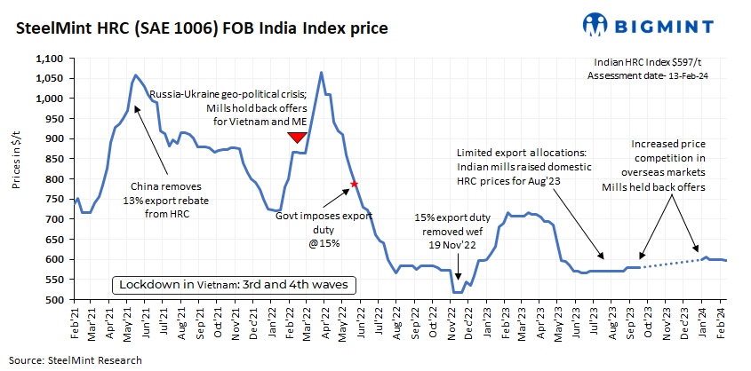 BigMint’s India HRC (SAE 1006) export index (for the Middle East and Vietnam) inched down w-o-w to $597/tonne (t) FOB against $599/t FOB east coast India, amid weakened global market sentiment. This decline comes amidst holiday periods in Vietnam and China. Additionally, Indian HRC export offers to the European Union (EU) witnessed a decrease of $10/t w-o-w.