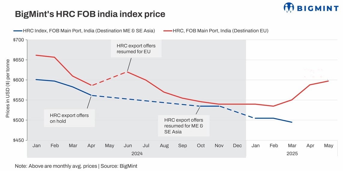 1. EU buyers prefer domestic material: Indian HRC export offers to the EU dropped by $10/t w-o-w to $630-635/t CFR Antwerp ($580-585/t FOB eastern Indian port) against $640-645/t CFR last week. Moreover, trade activity is likely to stay subdued in the near term, as European buyers continue to prefer domestic HRC supplies due to faster delivery timelines and anticipated post-summer restocking needs. Additionally, Indian steel producers are said to be prioritising the domestic market, where they are securing better price realisations. “Indian HRC offers to the EU are considerably higher compared to those from other Southeast Asian mills,” informed a reliable source.