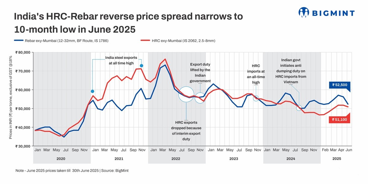 India’s HRC-rebar reverse spread narrows to 10-month low in Jun’25 ​as rebar prices drop sharply