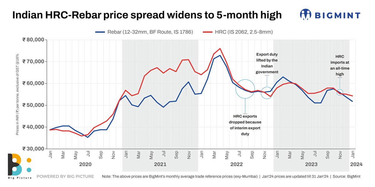 Morning Brief: The spread between benchmarked hot rolled coils (HRCs) and blast furnace-route rebar widened to a five-month high, at INR 2,500/t tonne (t) ($30/t), in January 2024, reveals BigMint data. The gap widened mainly on account of the sharper fall in rebar prices compared to hot rolled coils (HRCs).