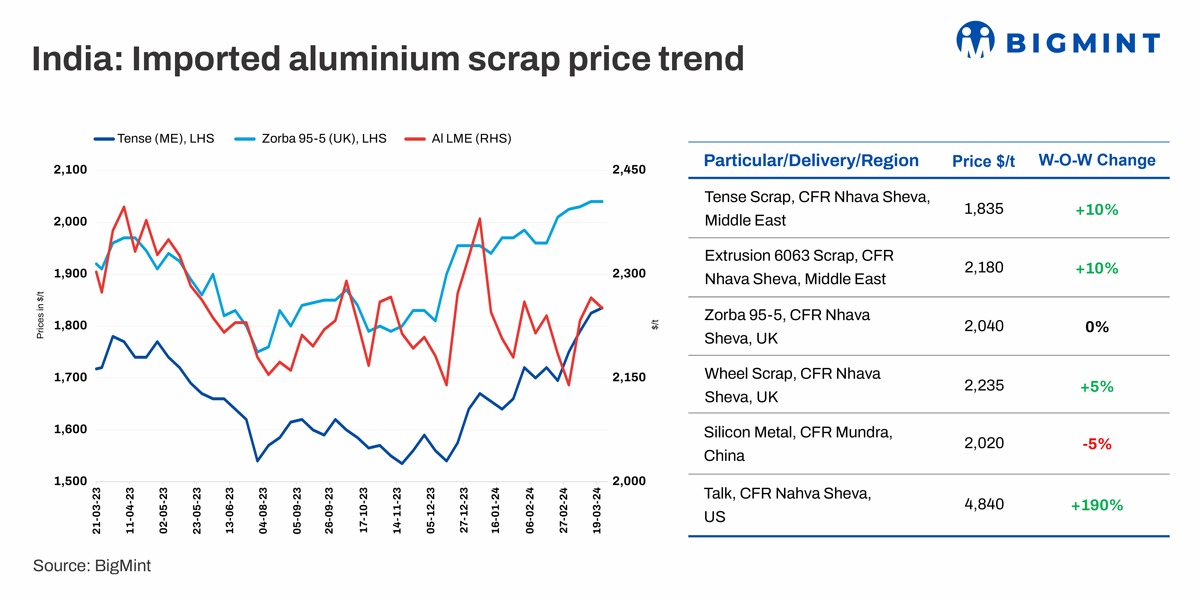 According to assessments by BigMint, aluminium imported scrap prices have increased slightly by up to 0.9%. Tense scrap from the UAE rose by $10/t to reach $1,835/t, while Zorba 95/5, UK origin, remained firm at $2,040/t CFR Mundra.