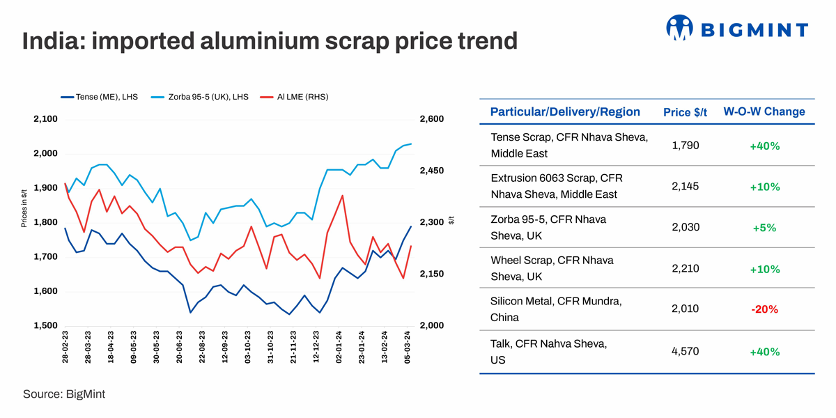 According to assessments by BigMint, aluminum imported scrap prices have increased up to 2.3%. Tense scrap from the UAE rose by $40/t to reach $1,790/t, while zorba 95/5, UK origin, increased by $5/t to $2,030/t CFR Mundra.