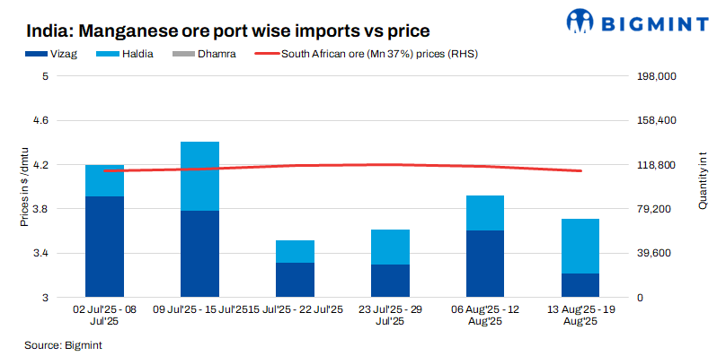 Imported cargo arrivals down w-o-w: Weekly manganese ore cargo arrivals to India decreased by 21% (Mn37%, Mn44%, and Mn46%) to 70,210t over 13-19 August 2025 against 90900 t in the previous week.