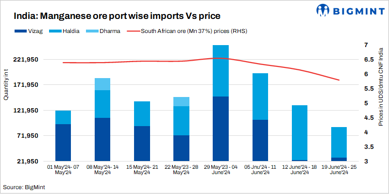 Manganese ore imports fall 32% w-o-w: Manganese ore cargo arrivals to India decreased by 32% w-o-w, with weekly shipments reaching 88,785 t between 19 June-25 June, up from 131,405 t in the previous week. The weekly import volume of manganese ore declined from the previous week on limited supplies of high-grade manganese ore from Gabon.