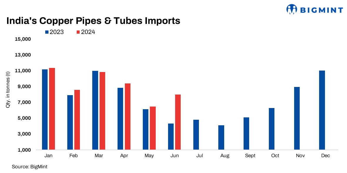 India’s imports of copper pipes and tubes up 23% m-o-m in Jun’24