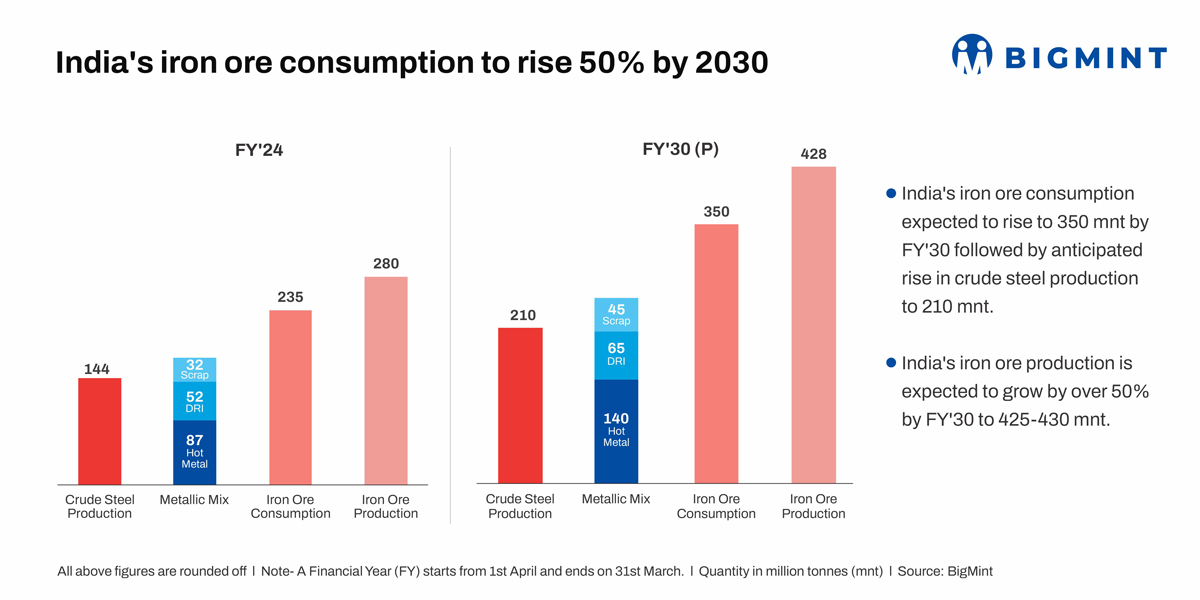 Blast furnace production to increase: Since the BF-BOF route will contribute more in India’s steel output, requirement for iron ore, coking coal and PCI will remain firm and rise in tandem. Thus, total iron ore consumption in India’s steel industry is projected to increase from 235 mnt in FY’24 to 350 mnt by FY’30.