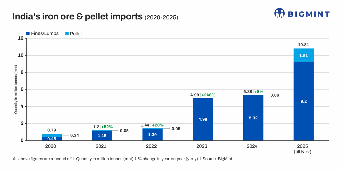 Morning Brief: India’s iron ore imports have already crossed 10 mnt in the first 11 months of CY25. In the first 11 months, total imports stood at 10.6 million tonnes (mnt), as per provisional data maintained with BigMint. Out of this, 9 mnt is fines and lumps and the rest, 1.55 mnt, iron pellets.
