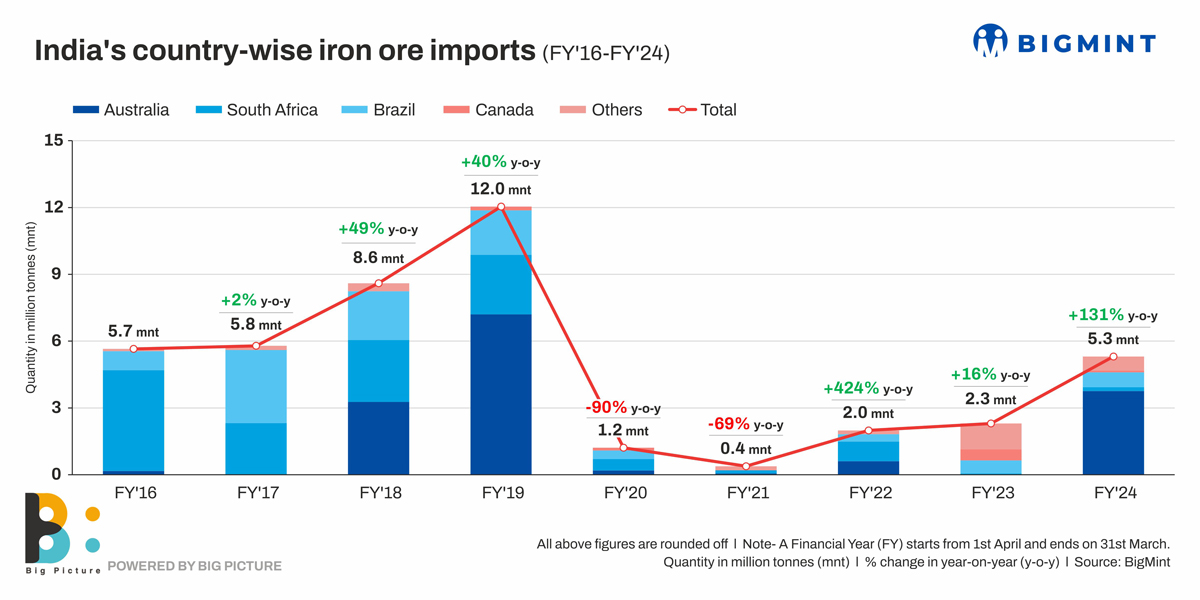 India’s imports of iron ore hit a five-year high of 5.31 million tonnes (mnt) in financial year 2023-24 (FY’24) compared to around 2.3 mnt in FY’23 – a huge increase of about 131% y-o-y, as per latest data available with BigMint. Australia was the largest exporter of iron ore to India at 3.76 mnt in FY’24. Australian miners pushed up their iron ore supplies towards end-March, 2024 before the end of their cyclone season. Brazil occupied the second position among the top exporters with 673,155 t, followed by South Africa at 172,810 t. Import volumes from Brazil and South Africa rose y-o-y by 16% and a sharp 186%, respectively.