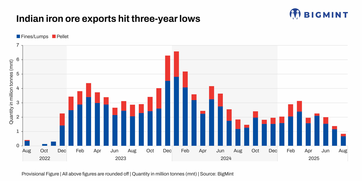 India’s total exports of iron ore, both fines and lumps, and pellets were recorded at 0.83 million tonnes (mnt) in August 2025. Out of 0.83 mnt, 0.67 mnt were fines/lumps and the rest 0.17 mnt pellets. Exports dropped to a three-year low on weak demand from China as well as supply pressure in the domestic iron ore market.