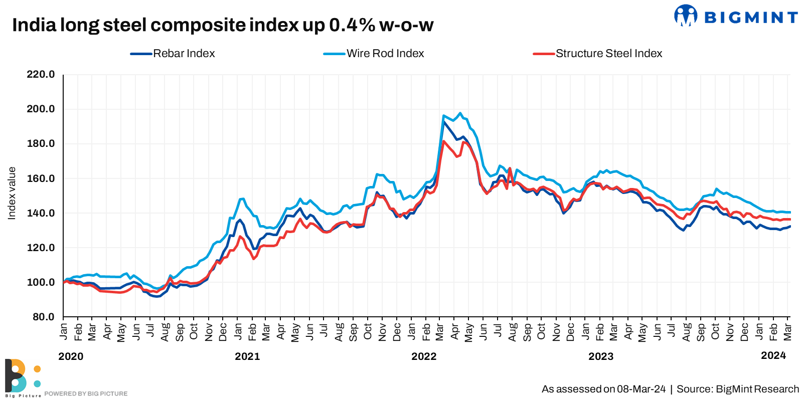 Tier-1 mills roll over rebar list prices: Keeping the current subdued market dynamics in mind, tier-1 mills rolled over their list prices of rebar for early March deliveries. As a result, landed prices remained at INR 52,000-53,000/t ($628-640/t). Trade-level rebar prices rose by INR 300/t ($4/t) w-o-w to INR 51,900/t ($627/t) exy-Mumbai. Project segment prices seem to have bottomed out and are inert at INR 49,500-50,000/t ($598-604/t). The overall flatness in rebar stemmed from the fact that buying was very need-based. Infrastructure investments have slowed down ahead of the elections this year. Plus, there are liquidity issues this being a financial year-end.