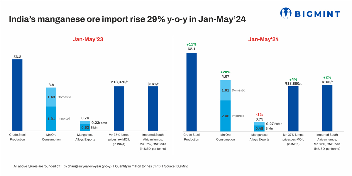 Morning Brief: India’s imported manganese ore volumes rose a sharp 29% y-o-y to 2.46 million tonnes (mnt) over January-May 2024 (5MCY’24) against 1.91 mnt in the same period last year.