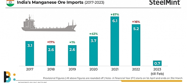 India’s manganese ore imports fell 24% m-o-m to 0.28 million tonnes (mnt) in February 2023 compared to 0.39 mnt recorded in January 2023, as per data maintained with SteelMint.
