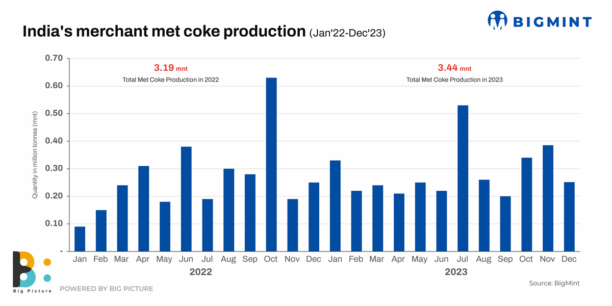 India’s merchant met coke production was assessed at 3.43 mnt in CY’23 compared with 3.19 mnt in CY’22, an increase of 7.5% y-o-y. The domestic production growth rate was slow in view of surging crude steel production and coke demand, and domestic capacity utilisation remained restricted due to higher imports.