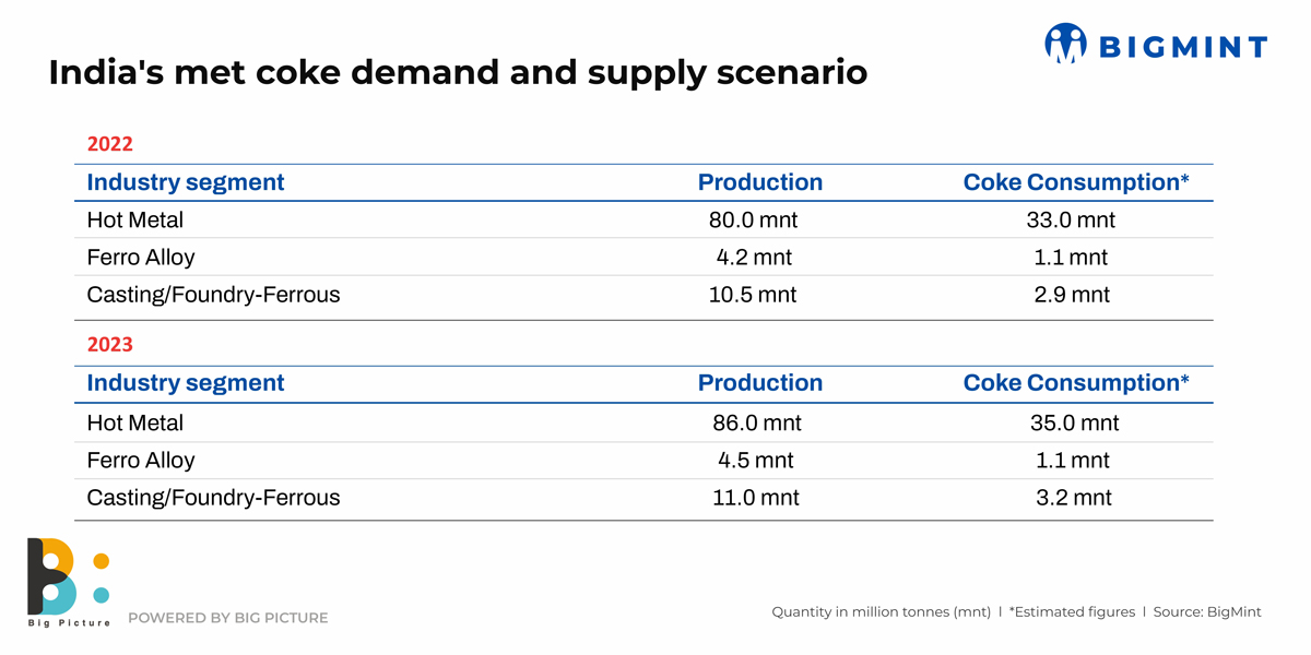 Coke demand increased on higher production of crude steel through the BF -BOF route, with hot metal production rising by 7.5% y-o-y to 86 mnt in CY’23. Demand for met coke in other areas of ferrous metallurgy such as sinter and pellet production and the ferroalloys and foundry sectors stood at around 11 mnt, data show-largely stable compared with 10 mnt in CY’22.